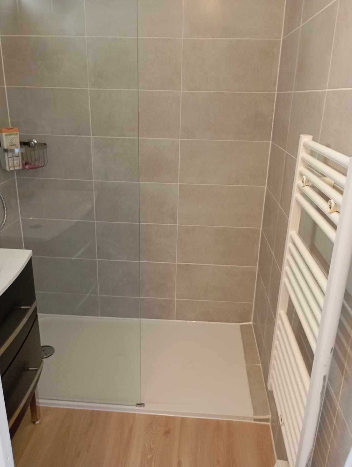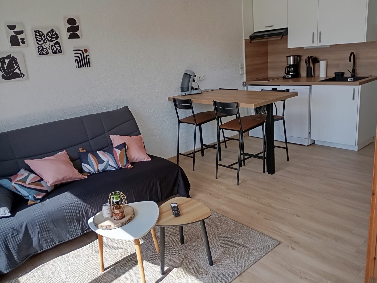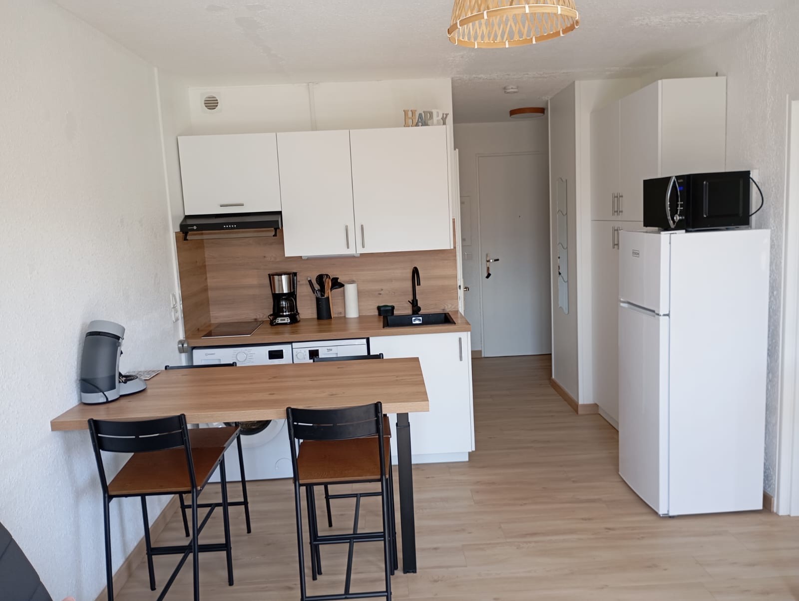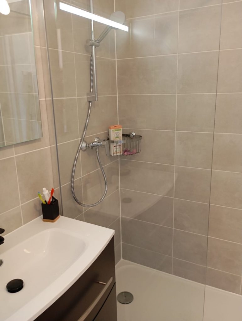 La cuisine, entièrement équipée avec plaques de cuisson, four, micro-ondes, réfrigérateur et cafetière Senséo, invite à préparer de bons repas dans une atmosphère conviviale. La salle de douche, moderne et lumineuse, apporte une note de confort, tandis que des WC séparés facilitent le quotidien de chacun.