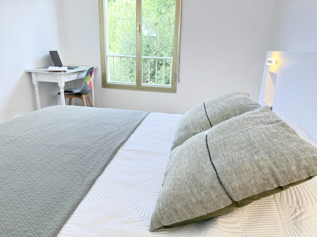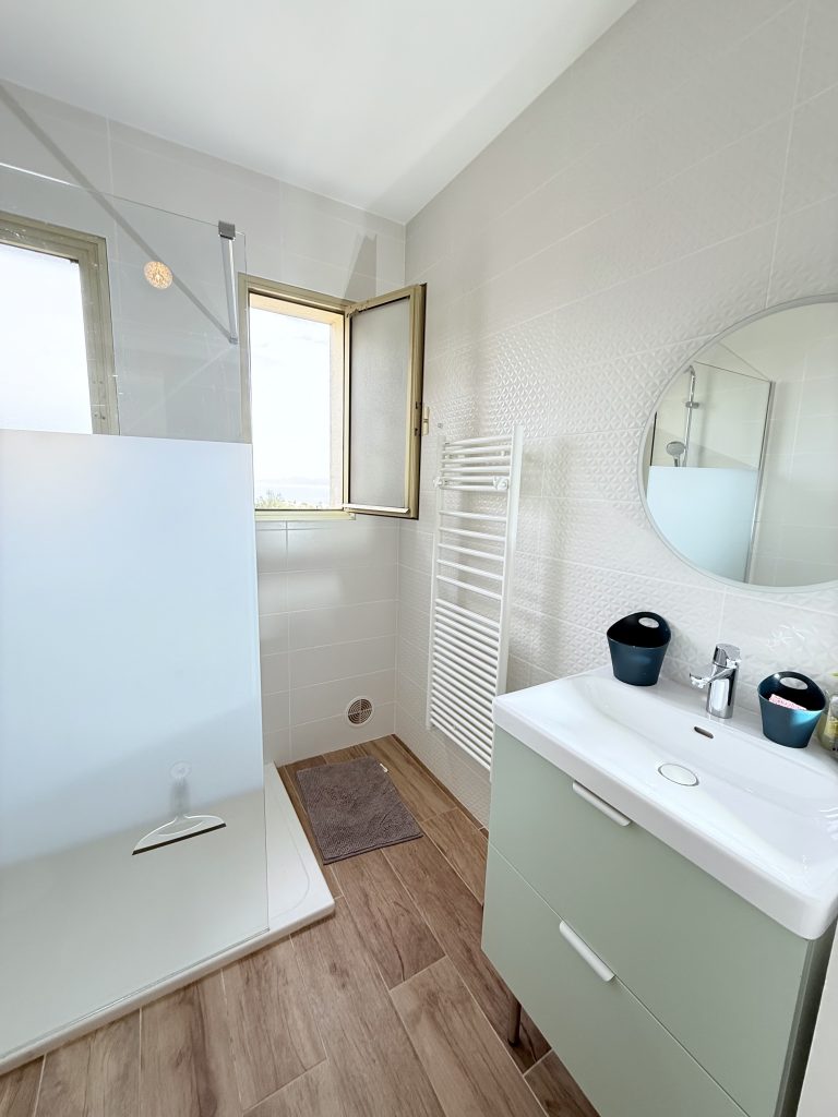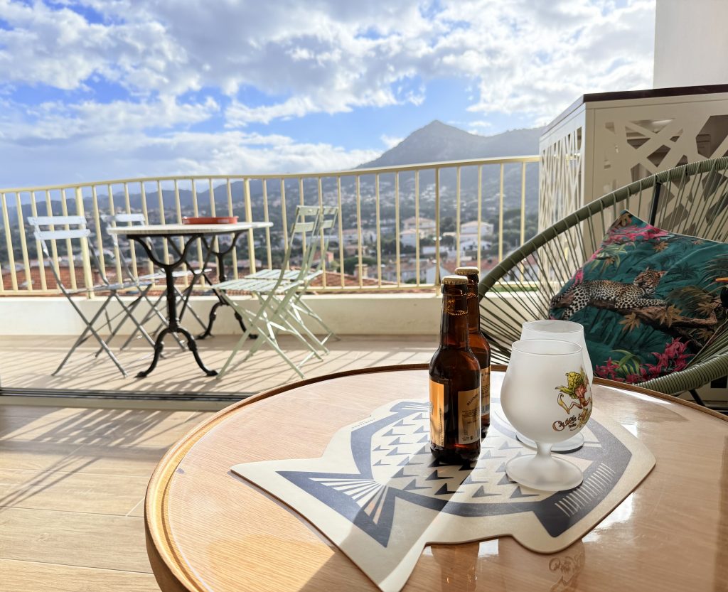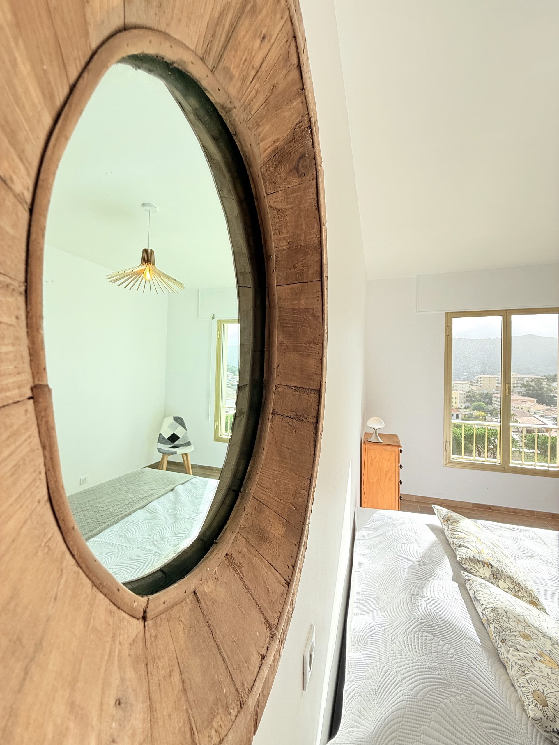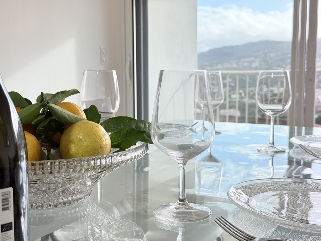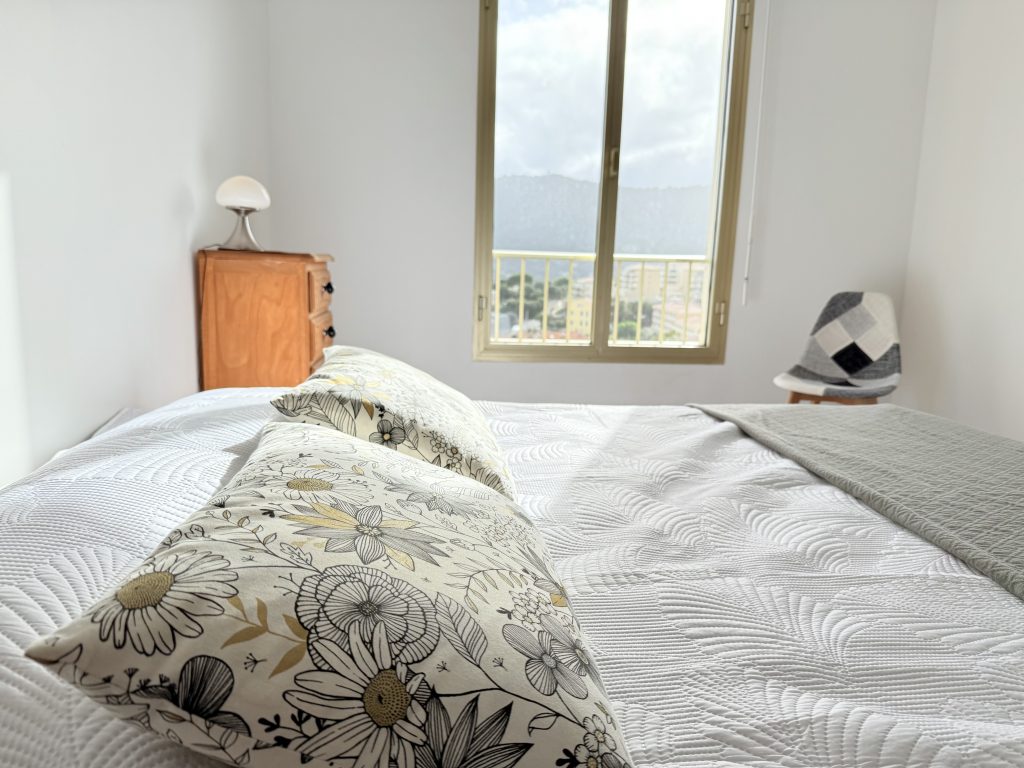 En entrant, on découvre un grand salon ouvert sur la salle à manger, baigné de lumière grâce aux larges baies vitrées. L’ambiance est douce, moderne, et invite naturellement à s’installer, à partager un repas ou simplement à profiter du calme. Le balcon, accessible directement depuis la pièce de vie, offre un point de vue sur la mer et les montagnes : un cadre parfait pour savourer un café au lever du soleil ou un verre en fin de journée.