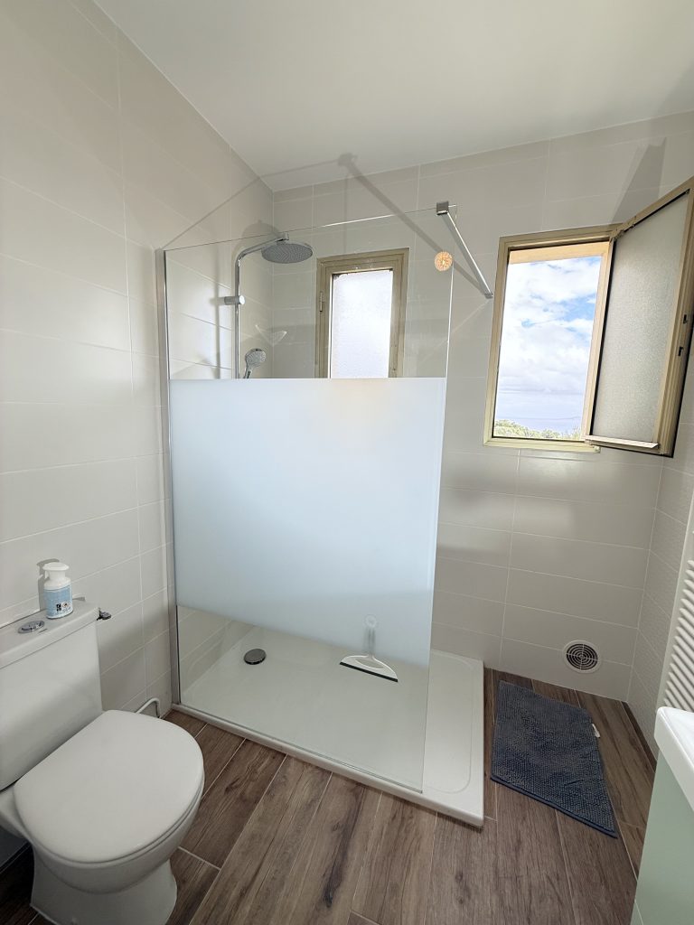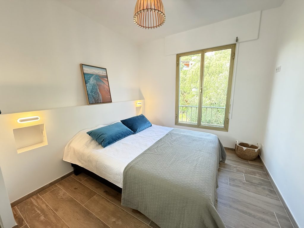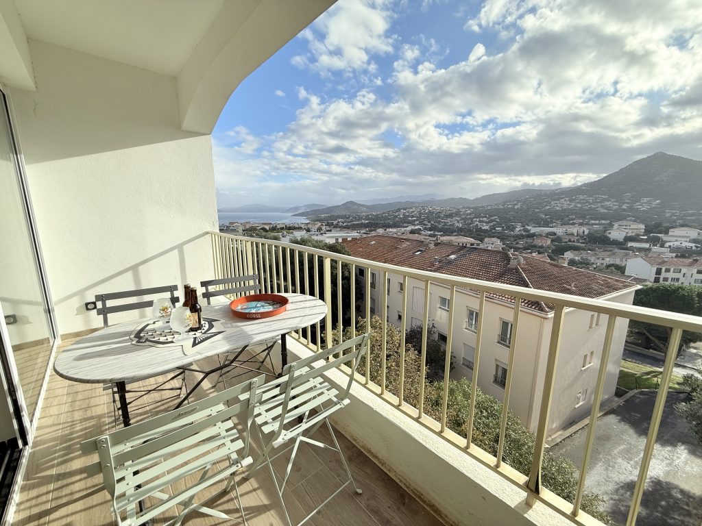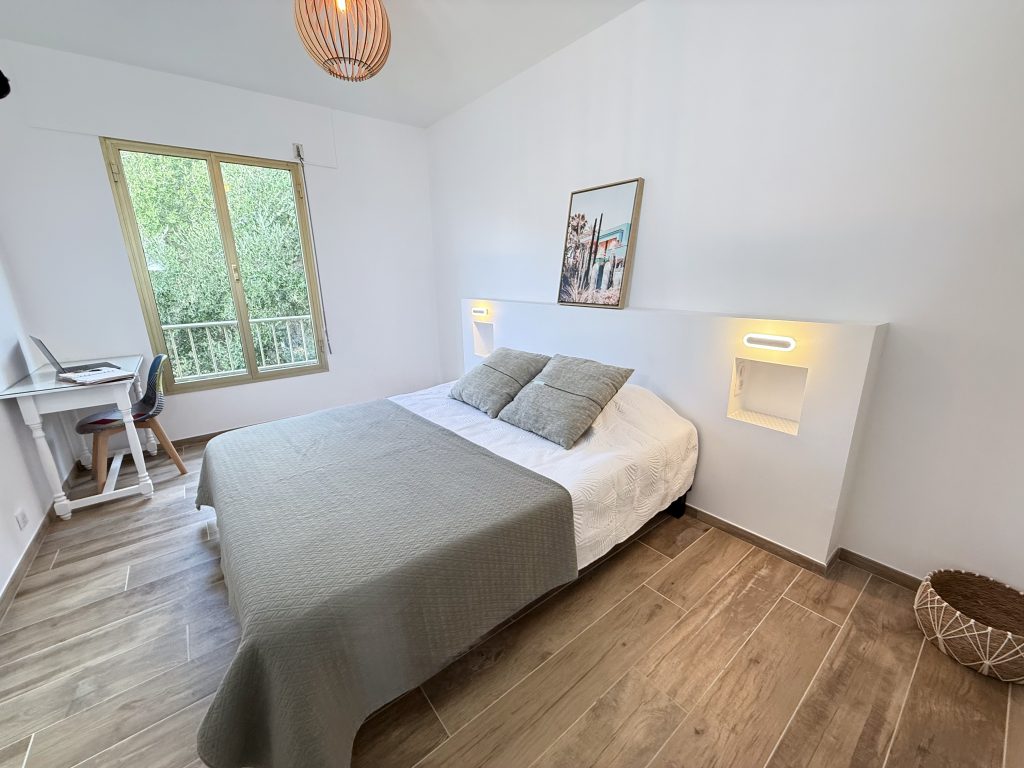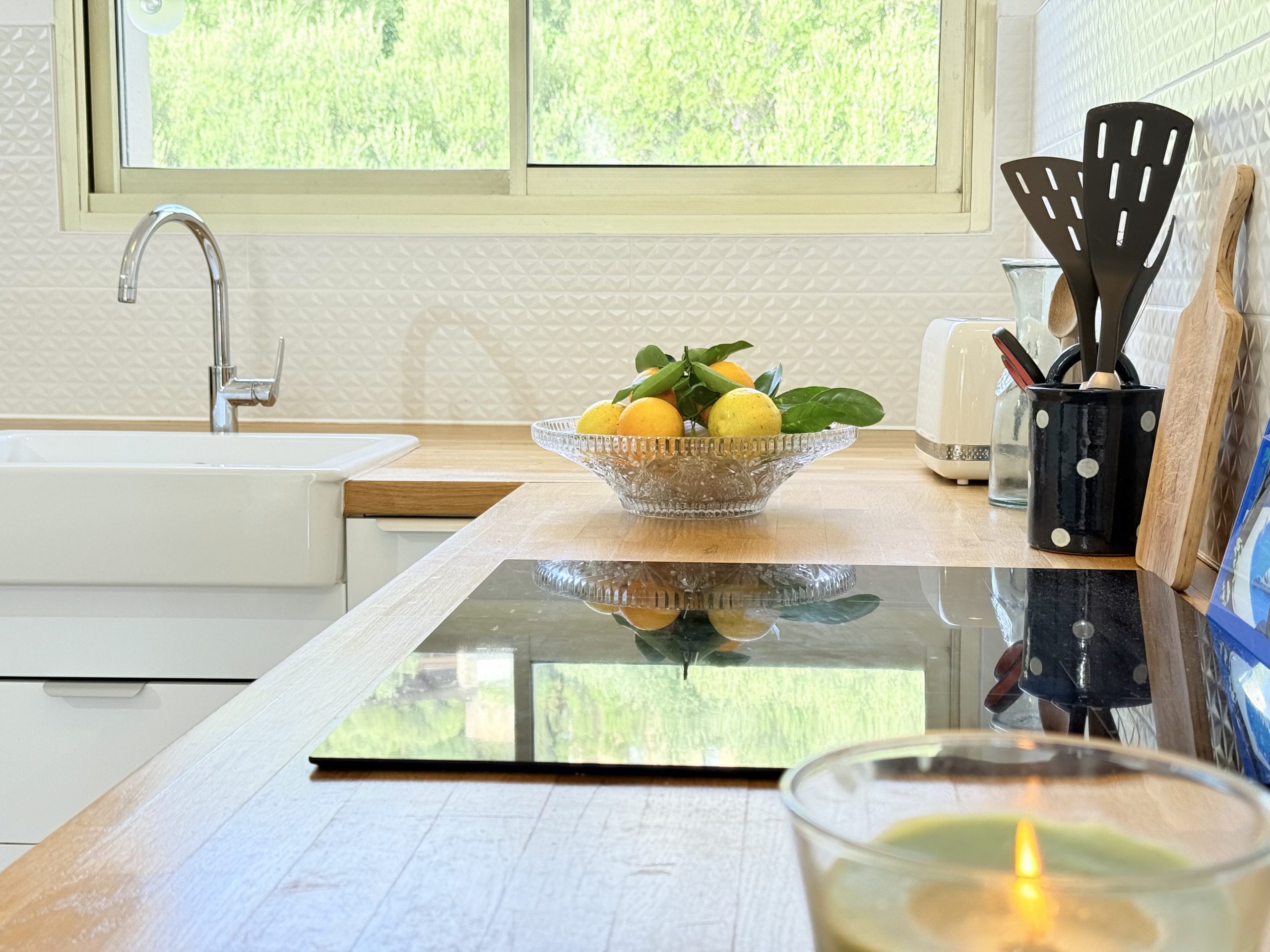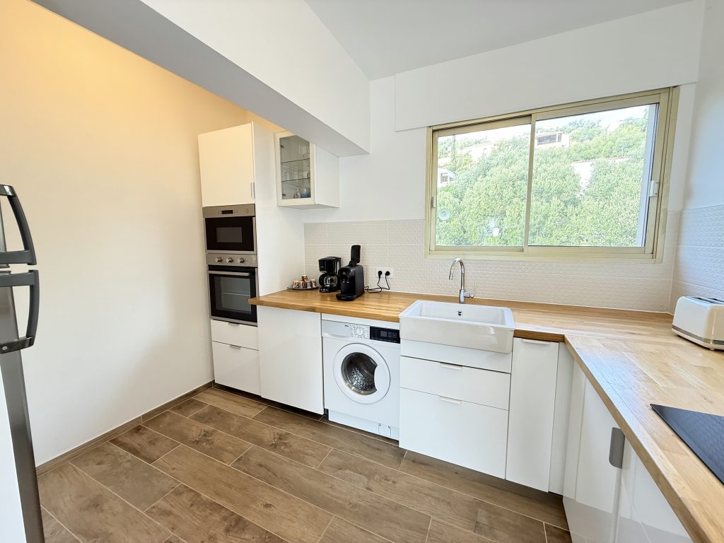 En entrant, on découvre un grand salon ouvert sur la salle à manger, baigné de lumière grâce aux larges baies vitrées. L’ambiance est douce, moderne, et invite naturellement à s’installer, à partager un repas ou simplement à profiter du calme. Le balcon, accessible directement depuis la pièce de vie, offre un point de vue sur la mer et les montagnes : un cadre parfait pour savourer un café au lever du soleil ou un verre en fin de journée.